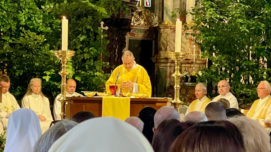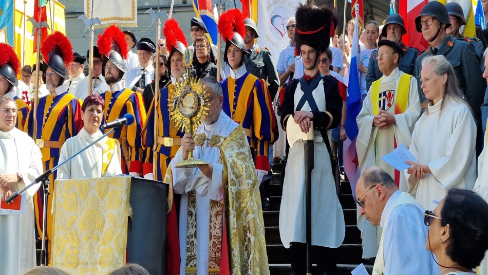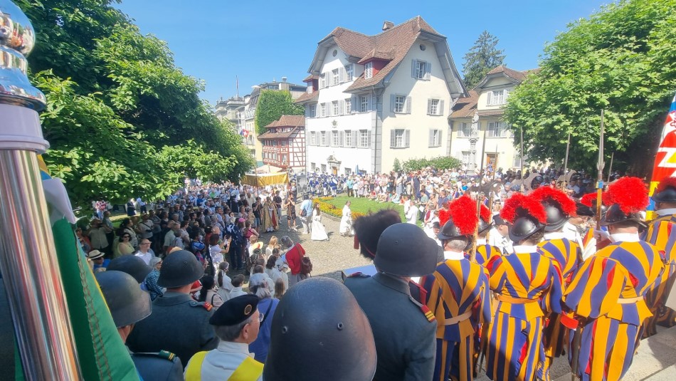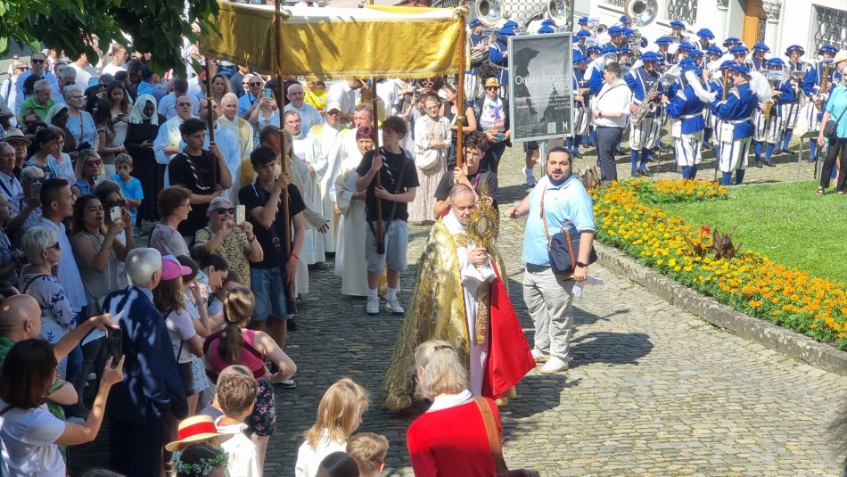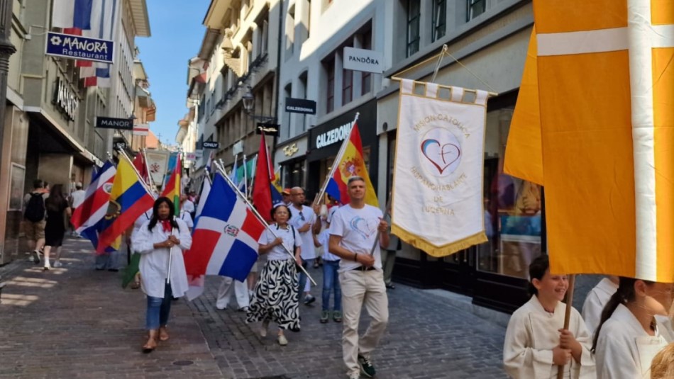 Jueves 19.06.2025: Celebración del Corpus Christi en la ciudad de Lucerna. Misa a las 9:00 en la iglesia de los franciscanos, seguida de la procesión que atraviesa la ciudad hasta llegar a la escalinata de St. Leodegar donde tiene lugar la última bendición. Presidió este año el P. José Luis, lo cual fue motivo de alegría y sano orgullo para los miembros de la comunidad hispanohablante, quienes en gran número se hicieron presentes portando las banderas de sus respectivos países y la camiseta con el logo de la Misión. ¡Canemos al amor de los amores! ↓↓↓